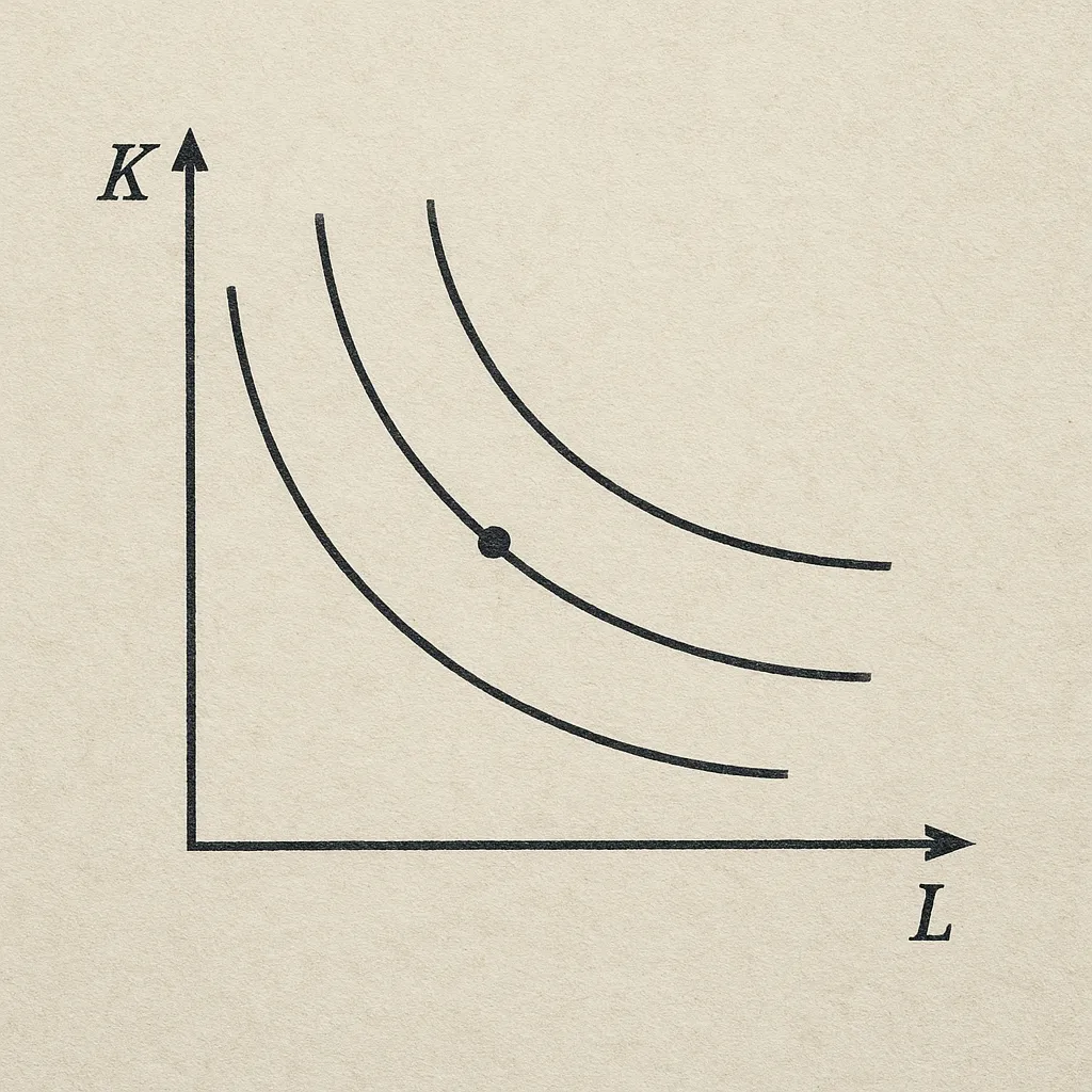 W praktycznej optymalizacji producent stoi przed dwiema krzywymi: izokwantą (stały poziom produkcji) i izokostą (linia stałego kosztu). Izokosta przedstawia wszystkie kombinacje nakładów, które generują taki sam koszt całkowity C przy danych cenach czynników r_K i r_L:
